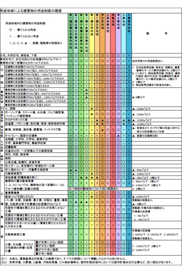 例えば、用途制限という科目で確実に得点をするのであれば、極端な話以下の表を頭に入れておく必要があります。