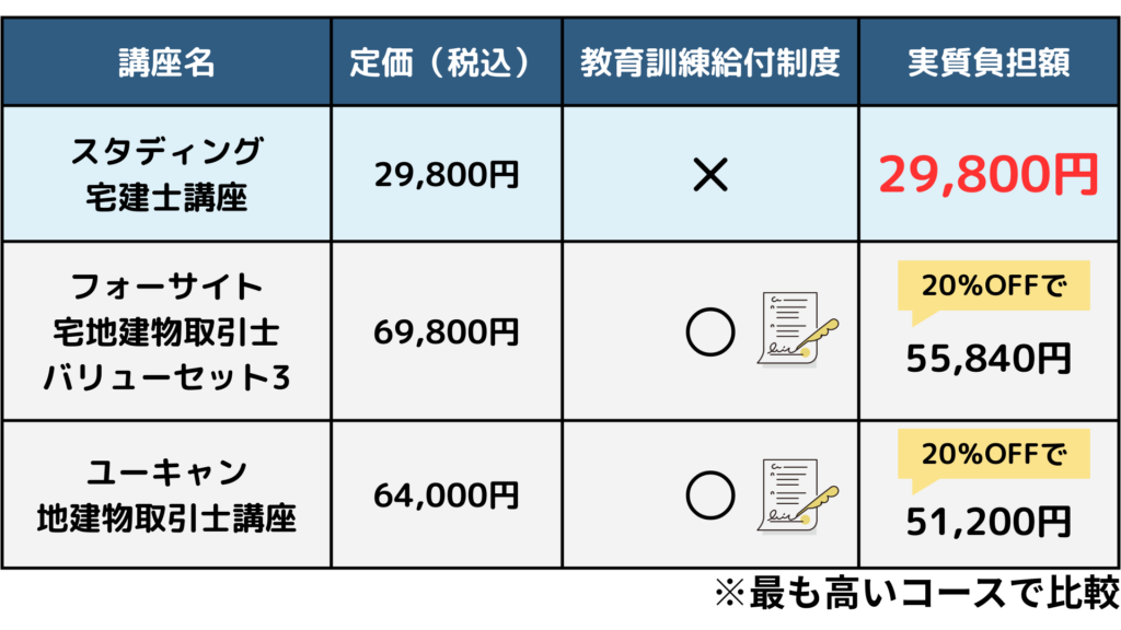 なぜなら、教育訓練給付制度を利用して他社の宅建士通信講座を購入した場合より、定価でスタディング宅建士講座を購入した場合の方が安いからです。