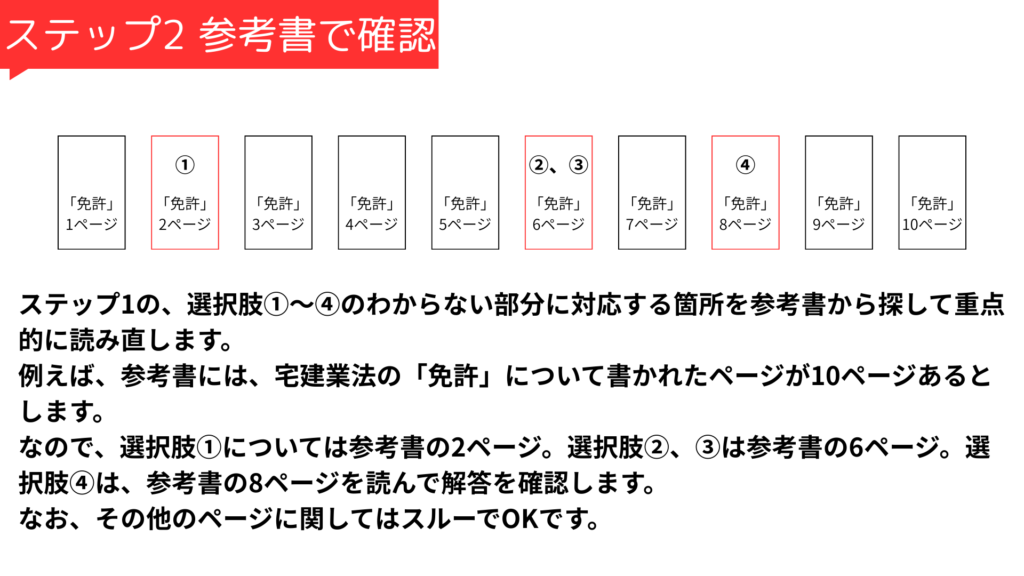 先ほど特定した、選択肢①~④のわからない部分を、参考書の中からピンポイントで見直してください。