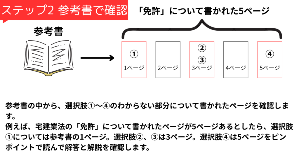 ステップ1で、選択肢①~④のわからない部分が見つかったら、ここで初めて参考書の出番です。
