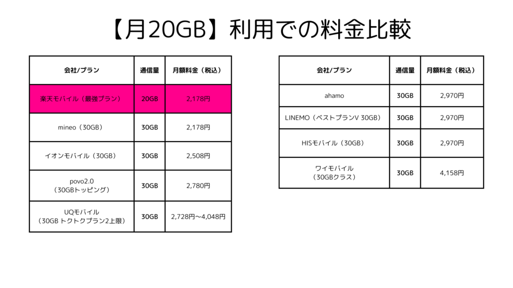 【月20GB】利用での料金比較