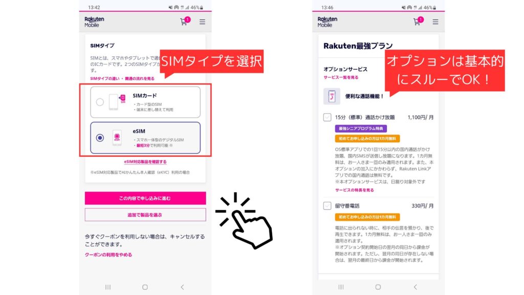 SIMタイプを選択する項目は画面の下の方にありますが、ここに辿り着くまでにオプションの勧誘がありますが、基本的にオプションは不要なのでスルーで問題ないです。