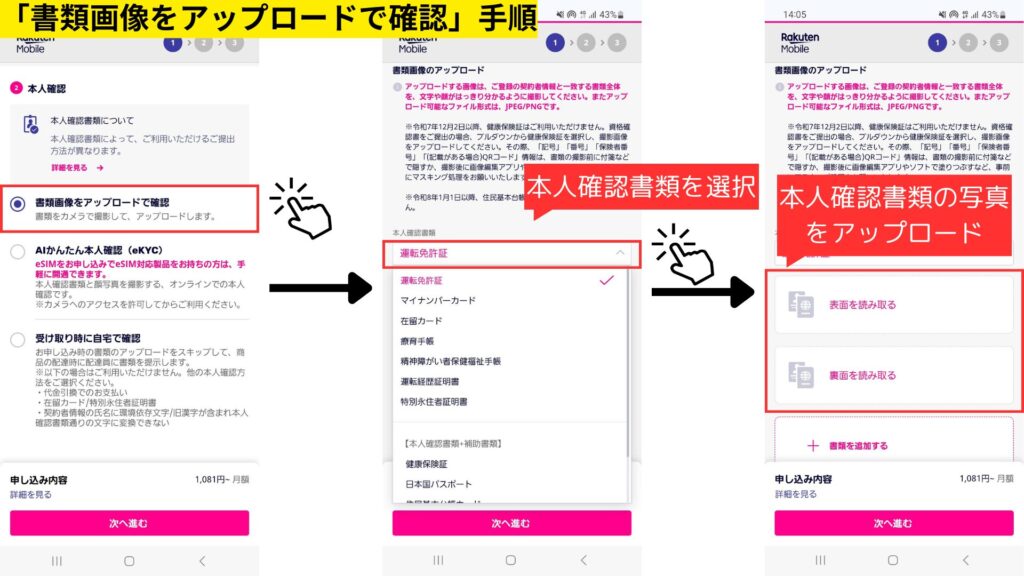 次に、本人確認書類をタップして運転免許証を選択して、スマホで事前に撮影した写真をアップロードしてください。