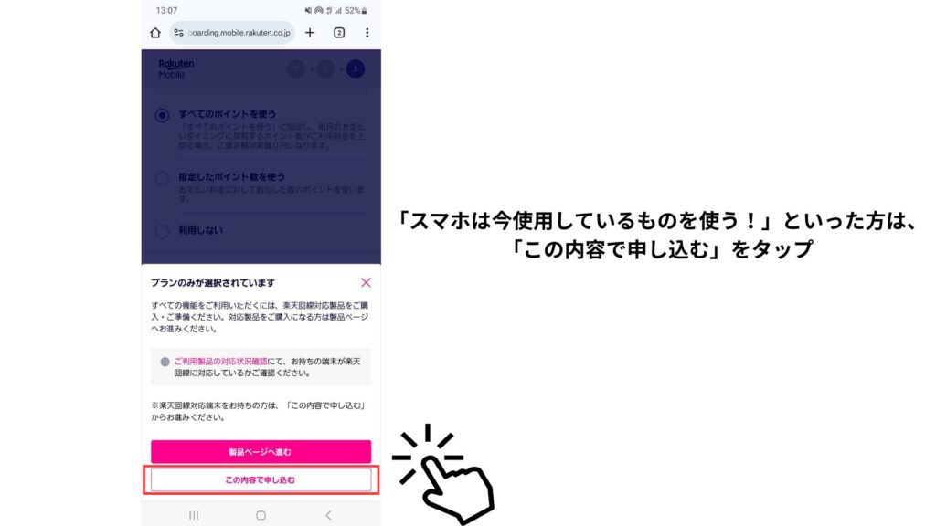 冒頭でも記載したように、この記事は、「スマホは今使用しているものを使う!」といった方向けの内容なので、「この内容で申し込む」を選択してください。