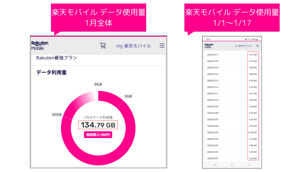 楽天モバイル 月・日別のデータ使用料