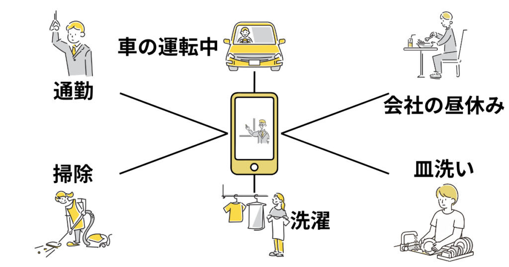 耳学のメリットとして、日常生活に勉強を溶け込ますことができ、以下のように「何かをしながら」勉強ができるため、スキマ時間の有効活用ができます。