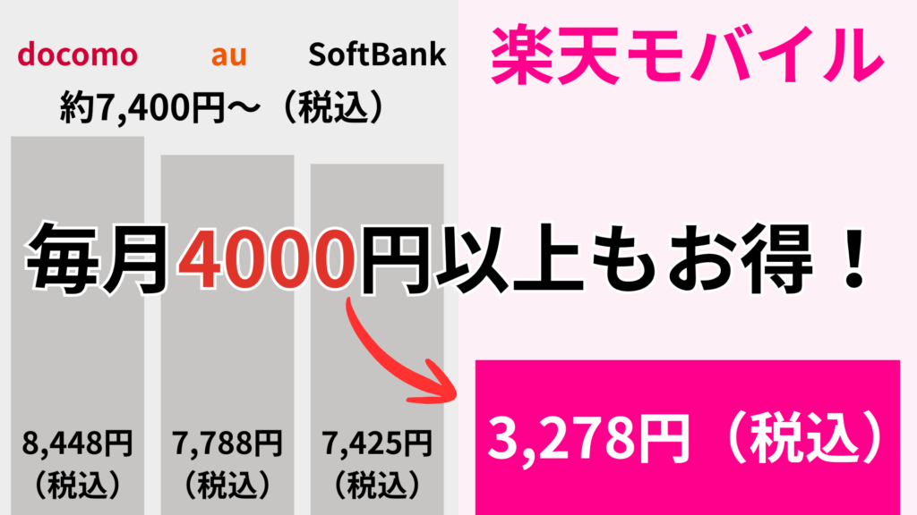 他社、特に3大キャリア(ドコモ、au、ソフトバンク)のデータ無制限プランを使っている方は、楽天モバイルへの機種変更を強くオススメします。