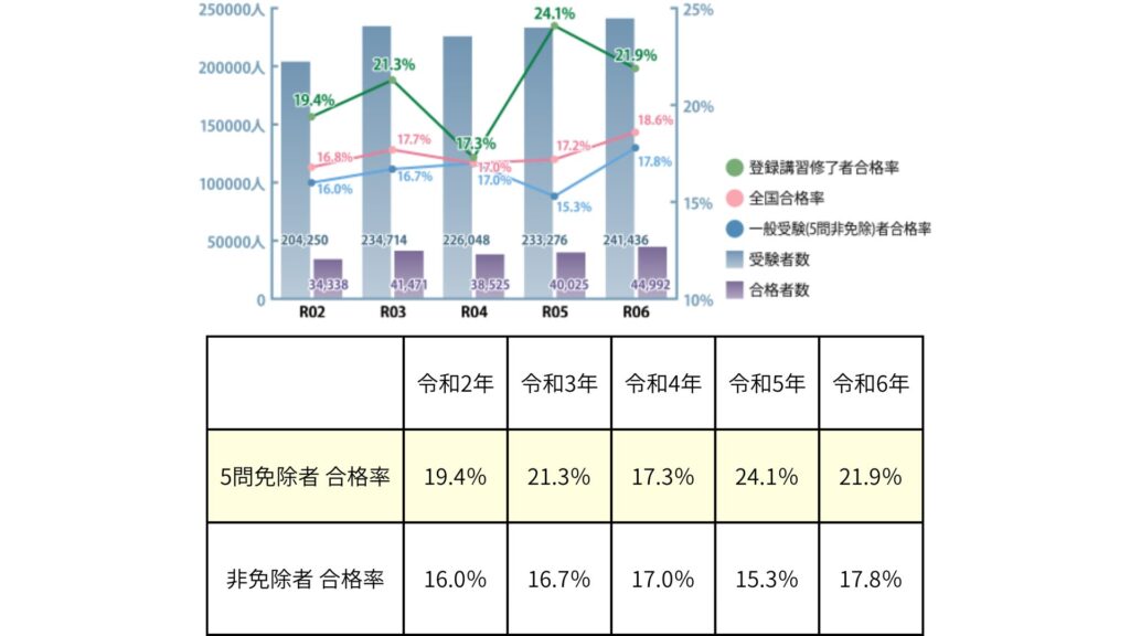 そして、実質的に5点持った状態で試験に挑めるため、非免除者(50問解く人)に比べて、当然5問免除者の合格率の方が高いというデータもあります。
