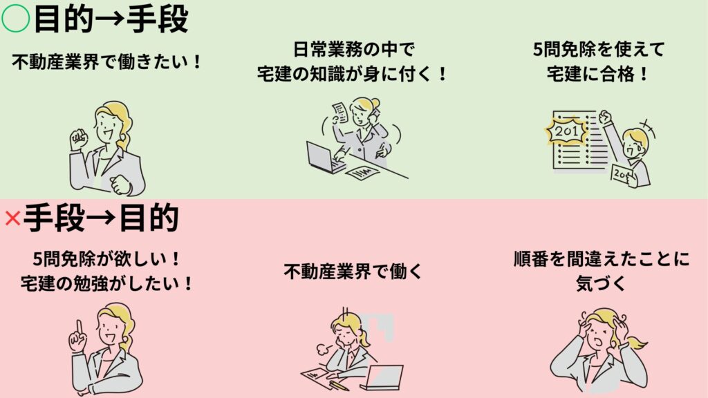 そのうえで手段として、「日常業務の中で宅建の知識が身に付く」や「5問免除が受けられた」という、おまけが付いてくる、と捉えるのが健全です。